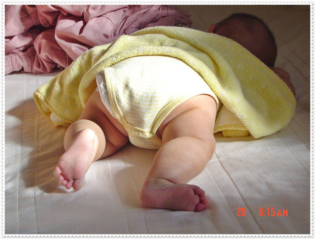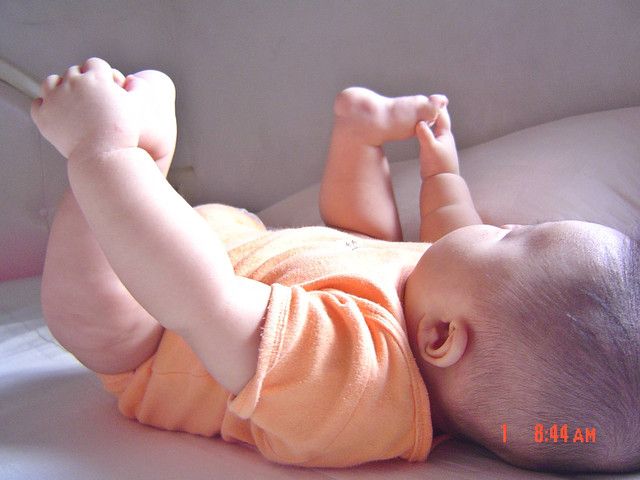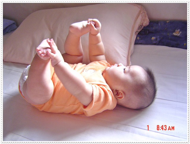 自己躺著時兩隻小腳就舉高高,兩隻小胖手就開始玩起了自的小腳ㄚ~